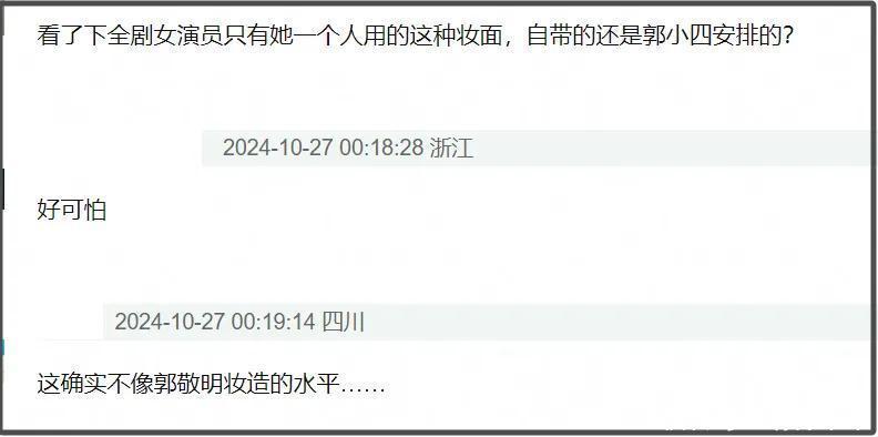 再有新星张淼怡,之前因“最丑林黛玉”激发公论热议,此次在郭敬明新剧中,她的造型相似令东说念主千里默。如同螳螂腿一样的假睫毛极具视觉冲击,扫数这个词妆容太接地气,网友玩弄就像低资本短剧中的扮装一样。驳倒区相似尽是质疑,均暗示很难服气这是郭敬明的审好意思水准。